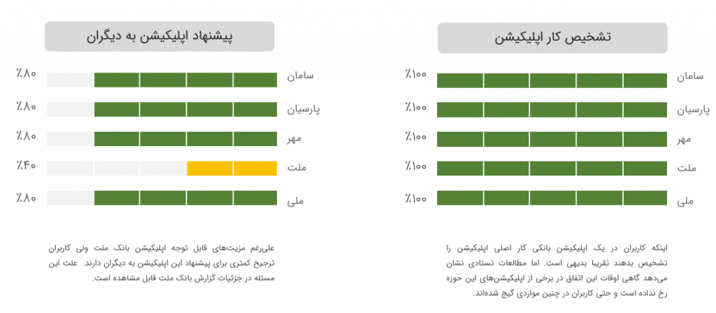 – ظهور نئوبانکها در سالهای اخیر، انتظارات کاربران از محیط کاربری اپلیکیشنهای بانکی را بالا برده است و درصورت به روز نبودن و یا پیچیده بودن محیط کاربری اپلیکیشنها، کاربران آنها را به دیگران توصیه نمیکنند. از بین اپلیکشنهای بررسی شده در این گزارش، کاربران کمترین تمایل را به پیشنهاد همراه بانک ملت به دوستان و آشنایان خود داشتند.