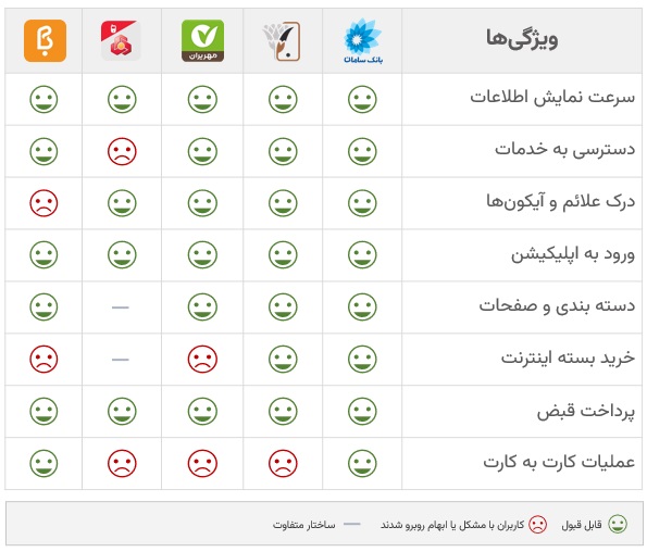در جدول روبرو در یک نگاه کلی میتوانیم نتایج بررسی سطح کاربردپذیری اپلیکیشنهای بانکی مورد مطالعه را در کنار یکدیگر و با توجه به نکات ذیل مشاهده کنیم: